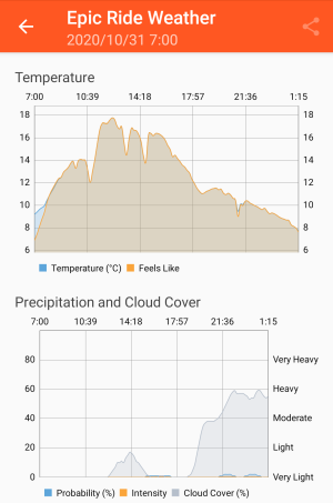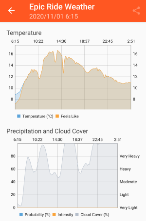 起きてすぐに「Epic Ride Weather」で天気を確認。道中、雨の心配はほぼ無さそう。気温はやはり下が6度。やはり冬装備が必要だと判断し、ネックウォーマーを装備に追加しました。