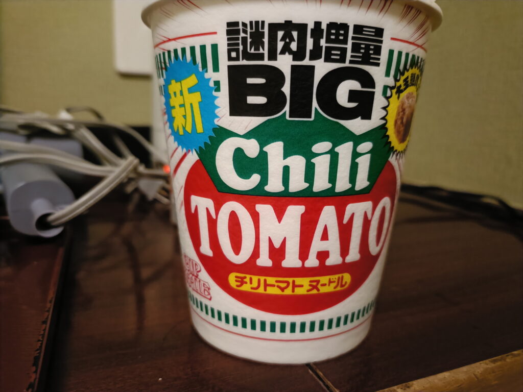 今年も朝ごはんはカップ麺。謎肉増量のチリトマトヌードルにしました。ビジネスホテルって電子レンジがあることは少ないけど、ポットはほぼ必ずあるのでカップ麺は作れるんですよね。