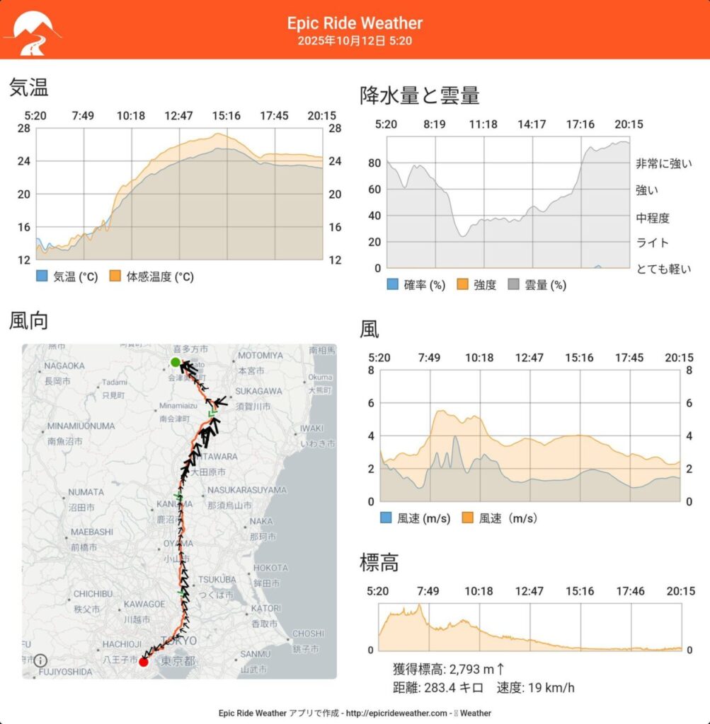 朝食を食べながら改めて天気を確認。昨夜の段階では「ゴール前に一雨降られる」という予報でしたが、雨予報が消滅。一日曇りの予報に変わりました。風向きは終始向かい風基調ではありますが、これくらいなら全然許容範囲。ただ、気温も昨夜の予報よりも上がっており、かなり暑そうです。