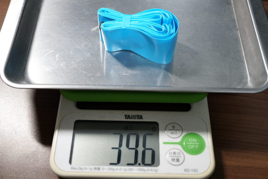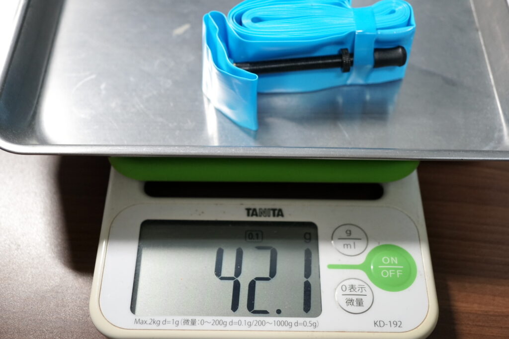48mmバルブが39.6g、60mmバルブが42.1gでした。昨今は30g台のTPUチューブが多いので、少々重めの部類に入ります。それでもブチルチューブよりずいぶん軽いですが。