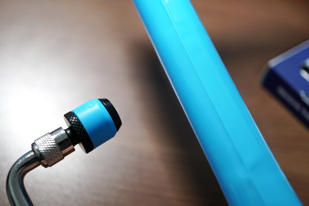 Clik社のクリックバルブのイメージカラーと思われる水色のチューブとなっています。バルブは真鍮製。