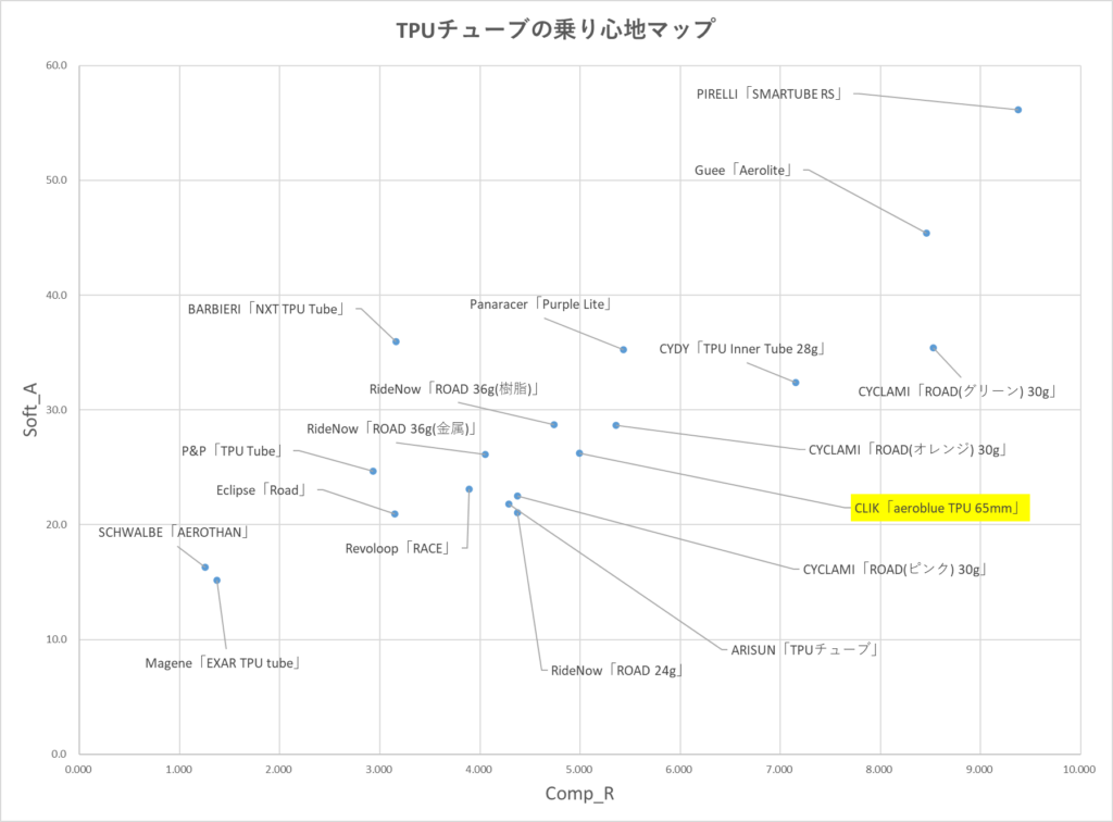 こちらは、TPUチューブの乗り心地実験と同様の実験を行った結果のグラフがこちらです。AeroBlueは、ほぼど真ん中の位置にいます。