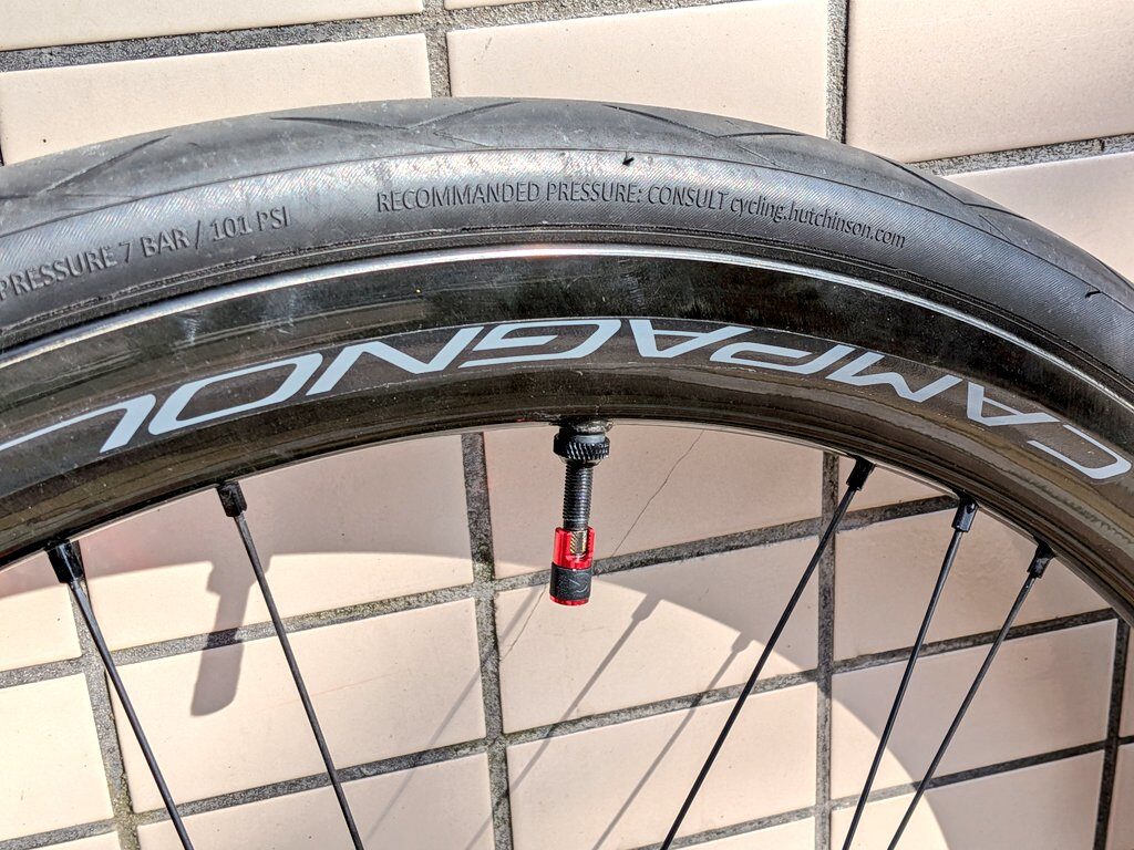 シャマルカーボンに、Hutchinson「BlackBird」+Clik「AeroBlue TPUチューブ」でテスト。チューブに付属していたバルブナットは頼りなかったので、BBB「CoreCap」に付いていたものを取り付けました。