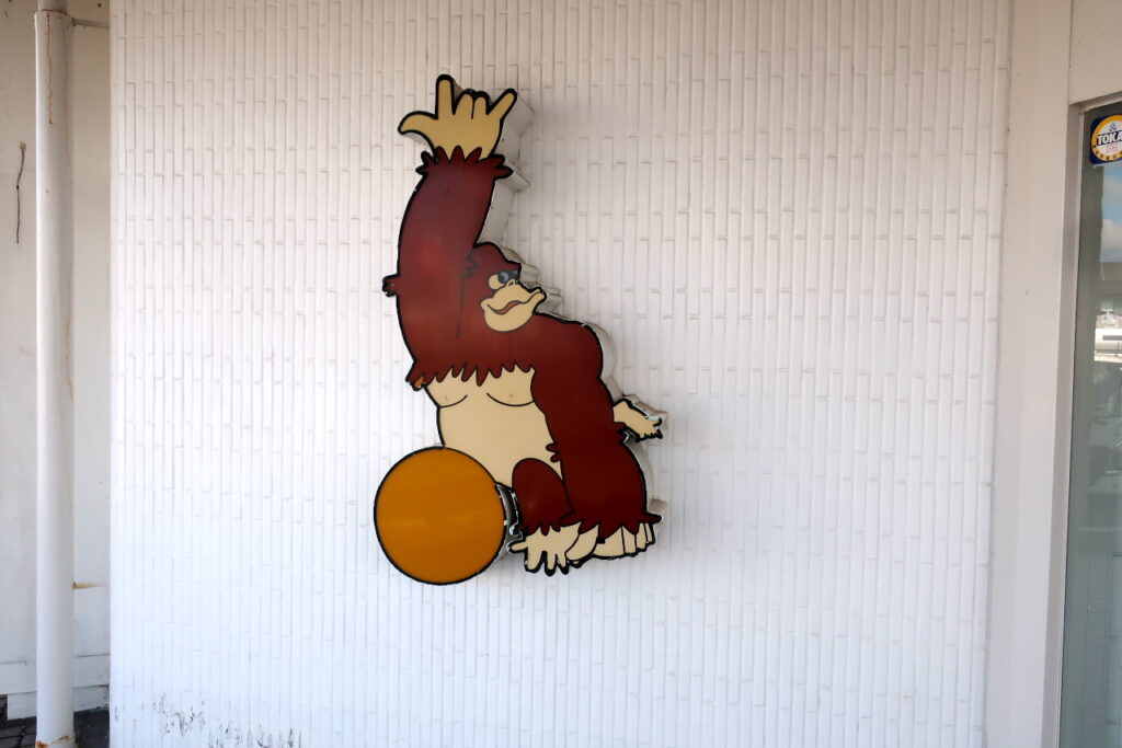 入口脇には、キャノンボウルのイメージキャラクターと思われるゴリラ。そして、閉店のお知らせ。悲しい。