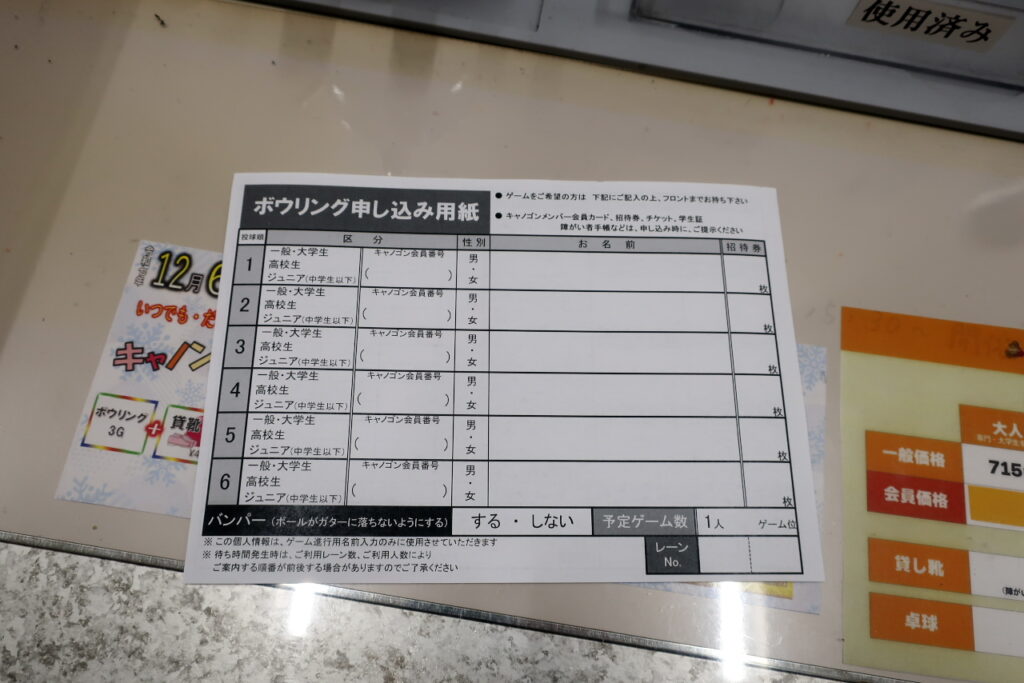 申込用紙に記入します。バンパーなしで、1ゲーム1本勝負で申し込みました。