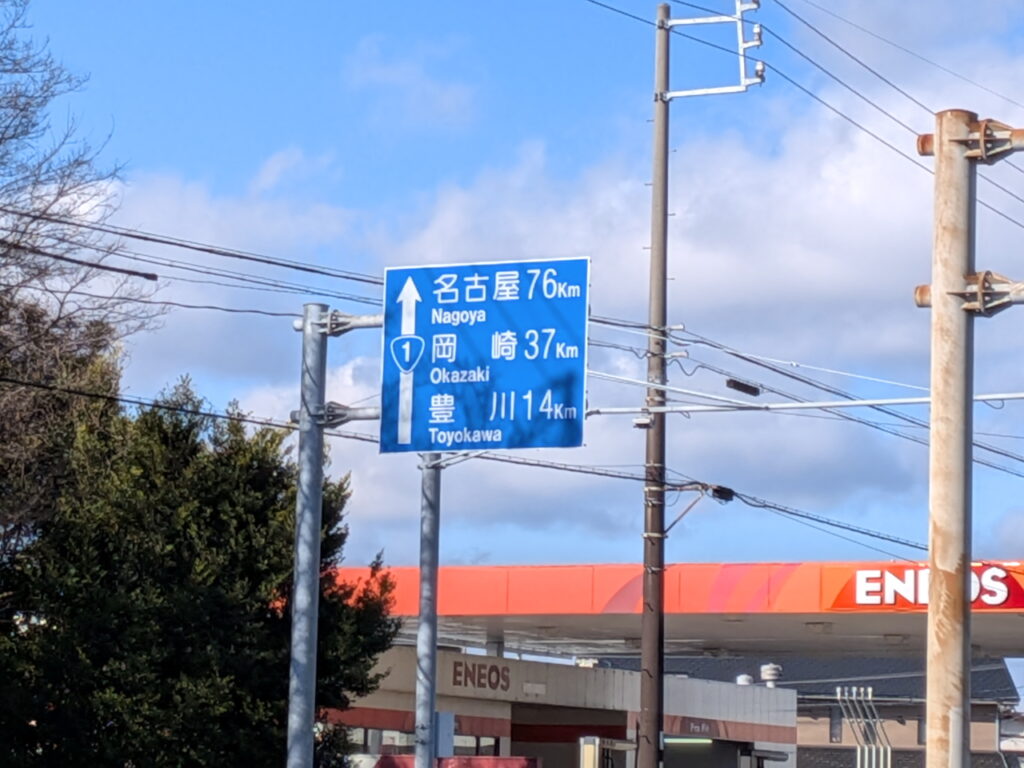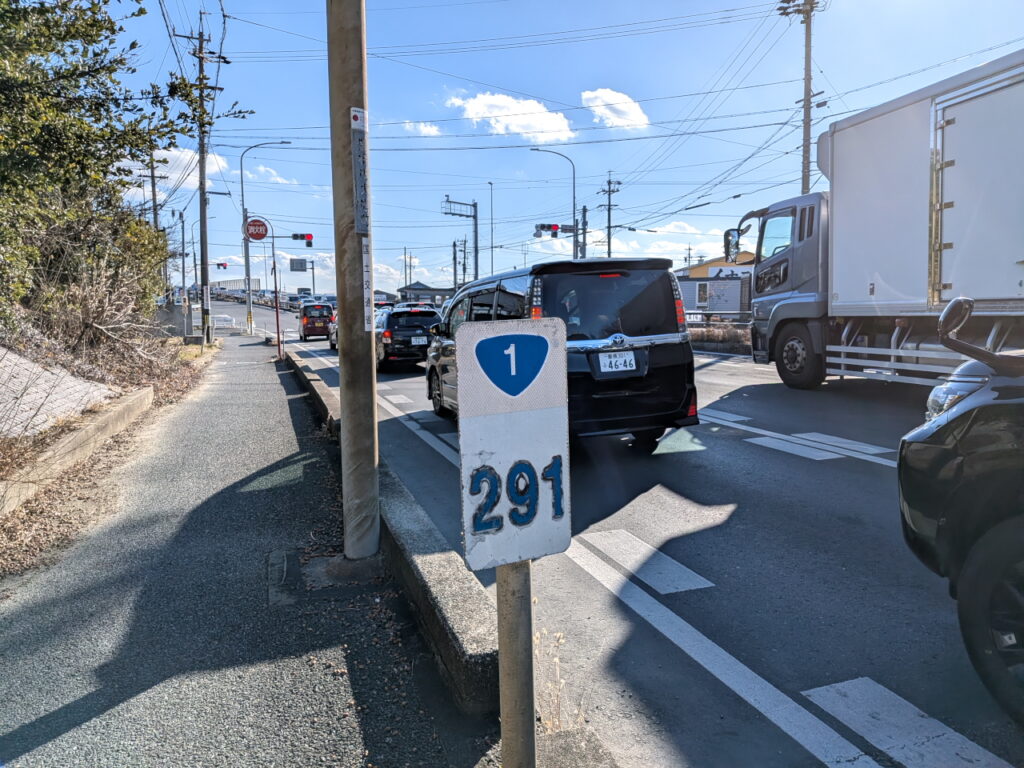 国道1号線を歩く。キャノボ中も見た青看板です。291kmのキロポストのすぐ近くにキャノンボウルがあります。
