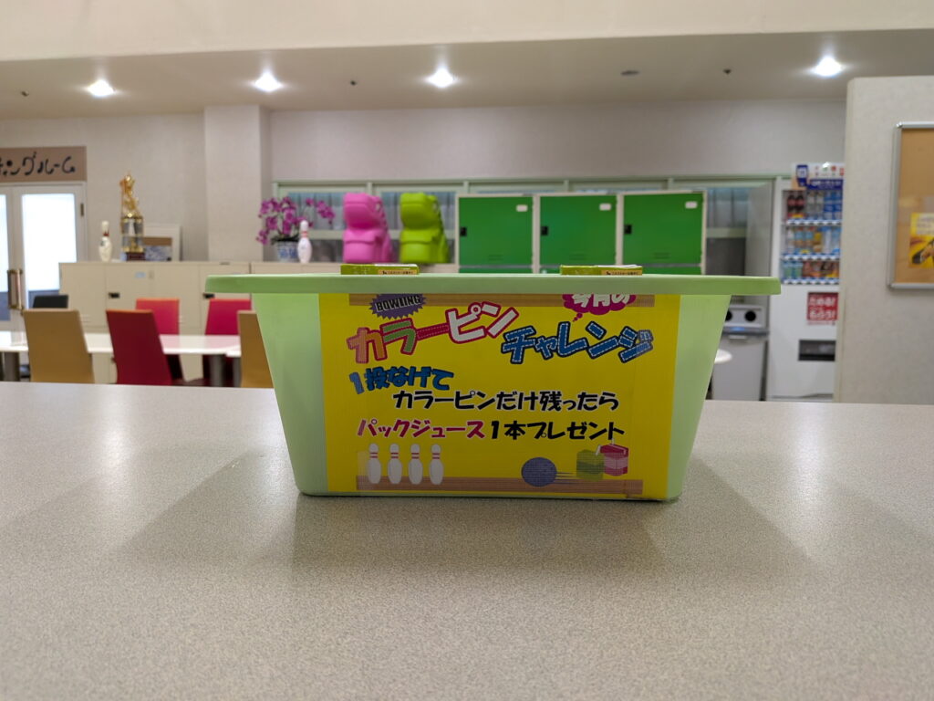 そして、このボウリング場はランダムで色の違うピンが混ざるようなのですが。「カラーピンだけ残ったらジュースをプレゼント」なる企画がありました。3投目で見事に1本だけカラーピンを残し、ジュースを獲得しました。