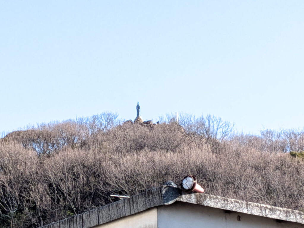 近くの山の上に仏像のようなものが見えました。これが岩屋観音ですね。