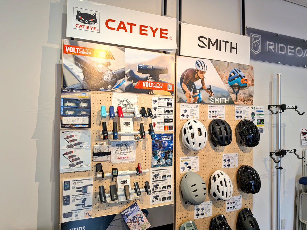 店内の様子。GE-110や、CATEYE・SMITHと言ったブランドの製品が置かれています。力を入れているのはミノウラのローラー台らしく、全種類が試乗可能とのこと。現在は一時休止中ですが、ペダリングセミナーも開催しているそうです。