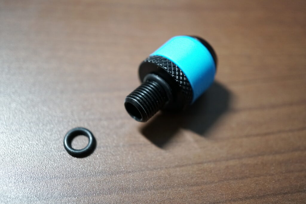 このように、口金のネジ山の根本部分にOリングを取り付けます。これでシールできるはず。