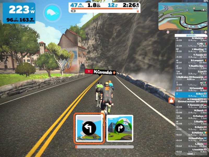 ZWIFTでは有名な選手も時たま走っており、バーチャルながらあこがれの選手と一緒に走れる世界でもあります。写真は、カヴェンディッシュを追走したときのもの。