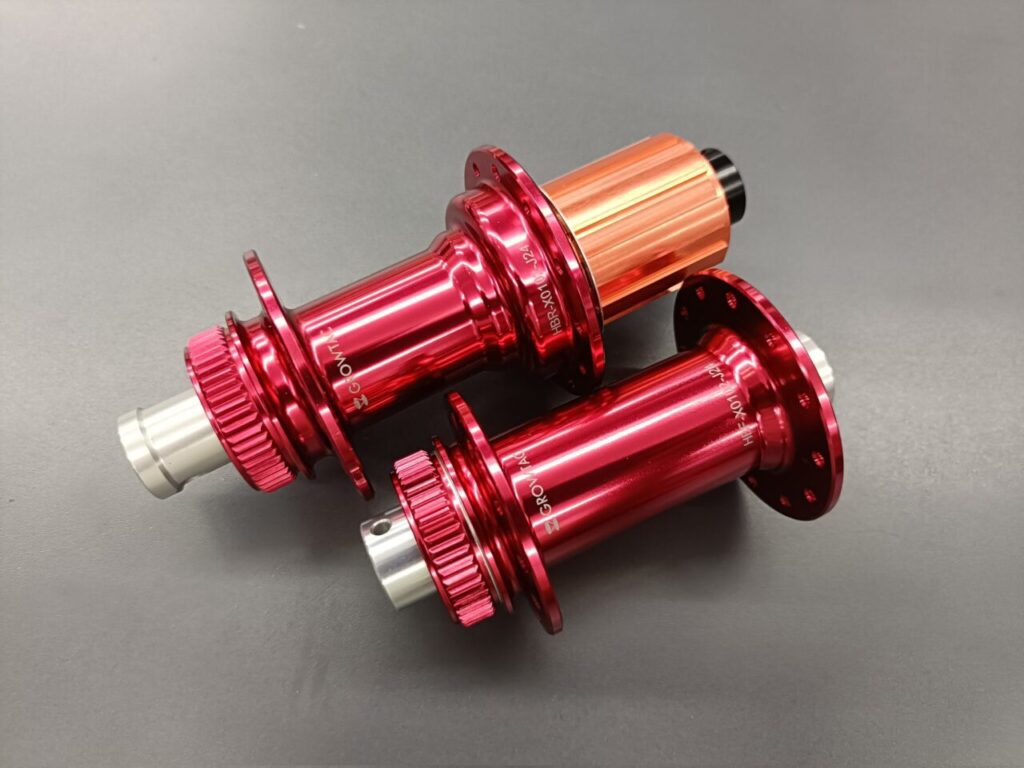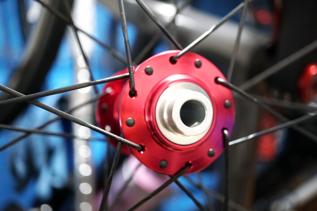 EQUALハブのレッドカラーです。昔ながらの爪式フリーボディを採用し、「ケミカルラビリンスシール」なる仕組みで水や汚れがハブ内に入りにくくなっています。