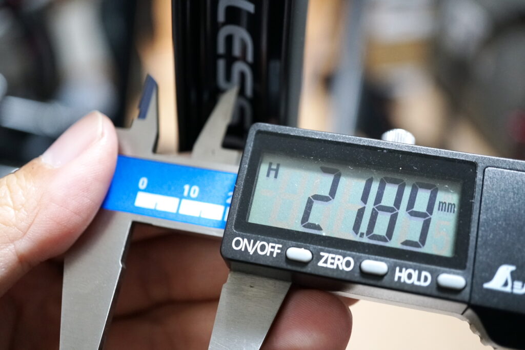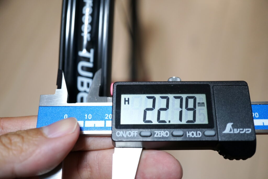 内幅は、前輪が22.8mm、後輪が21.9mm。エアロを意識すると前輪のリムが太くなるようです。個人的には内幅+5mm以上の太さのタイヤを使うことにしているので、これならばギリギリ28Cタイヤが使えます。