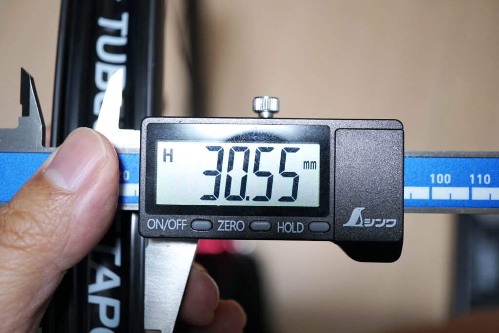 外幅は、前輪が30.5mm、後輪が28.9mm。やはりこちらも後輪のほうが太め。内幅19mm前提で設計された28Cタイヤをこのリムに付けると、前輪はタイヤとホイールがちょうど同じ幅になる計算です。