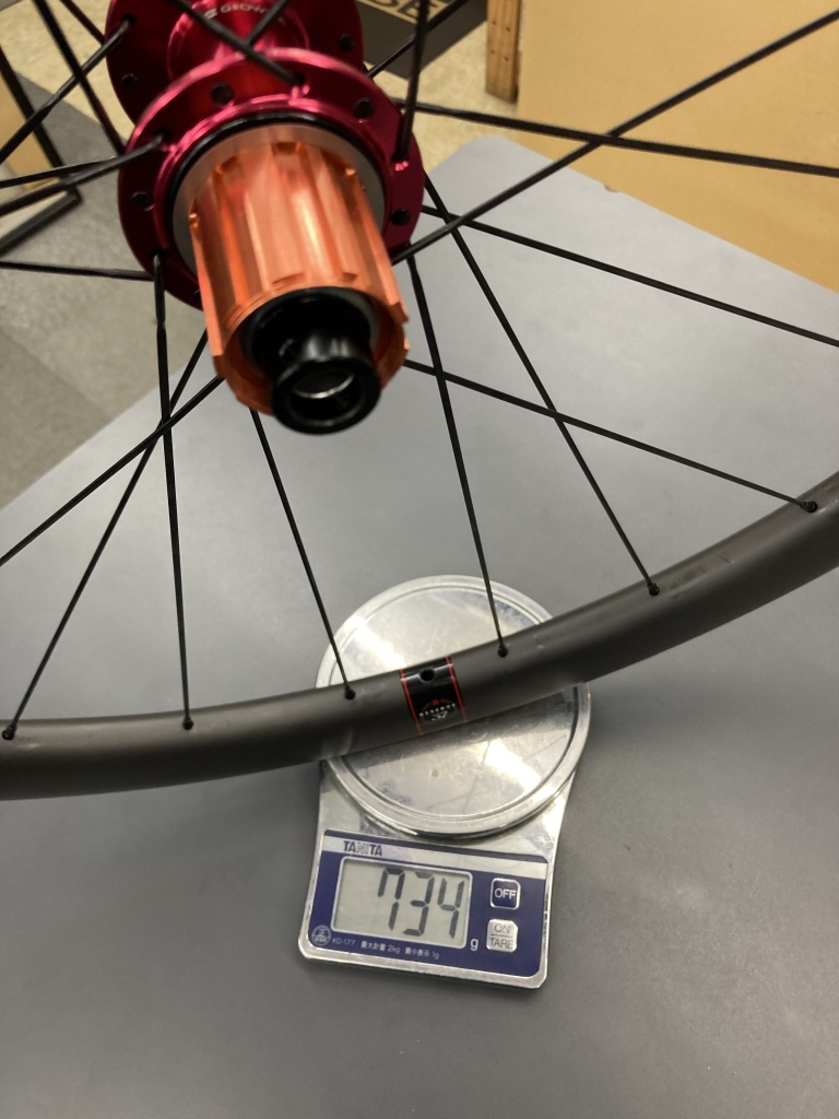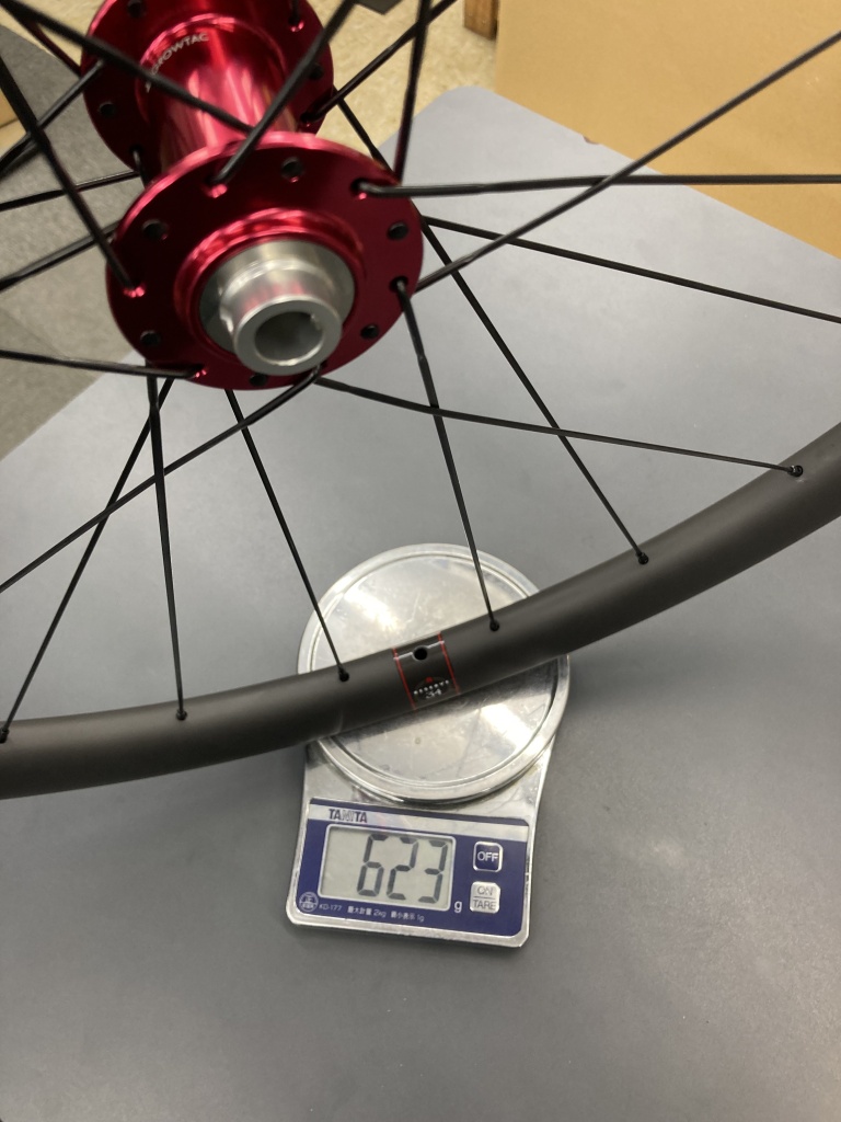 今回のパーツ構成では、前輪623g+後輪734g=1357gでした。リムテープを貼り付けた状態で+20gの1377g。十分に軽く仕上がりました。