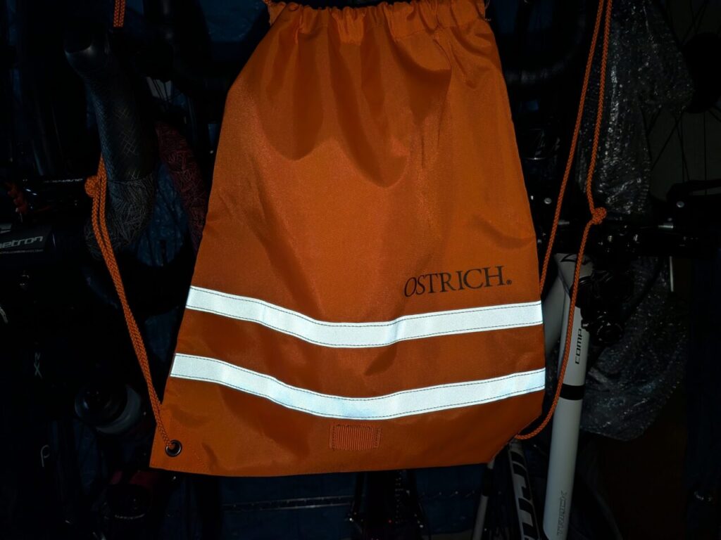 輪行袋で有名なオーストリッチが発売したナップザック。反射材が縫い付けられており、テールライトを引っ掛けるループも付いています。
