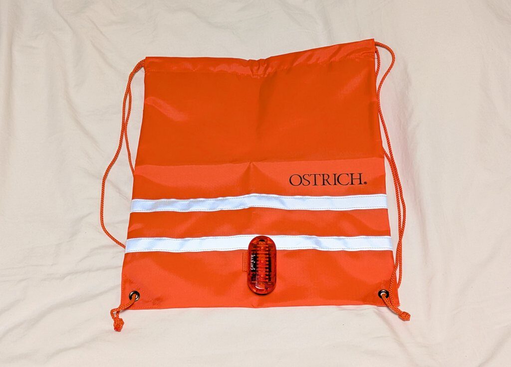 さらに目立たせたければ、ループ部分にテールライトを付けることも可能です。生地の色も蛍光オレンジですし、夜間のサイクリングでは反射ベスト代わりにもなりそうですね(ブルベでは多分不許可だと思いますが)。