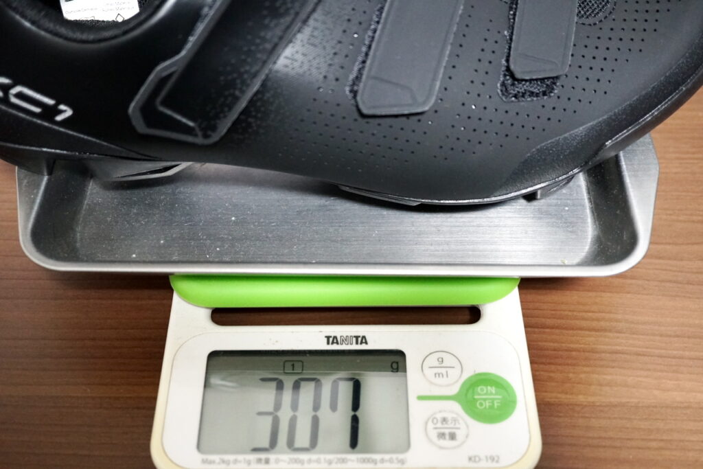 実測重量は307g(43サイズ片足)。公称重量が313g(43サイズ)なので、若干の下振れ。