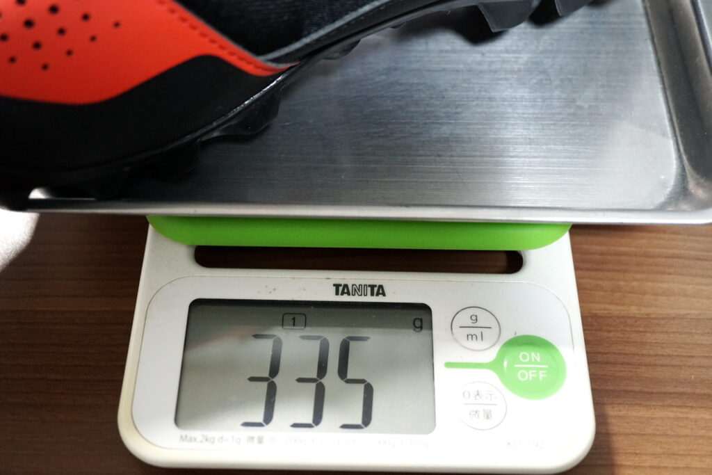 公称重量は325g(42サイズ)で、実測は335/334g(43サイズ)。