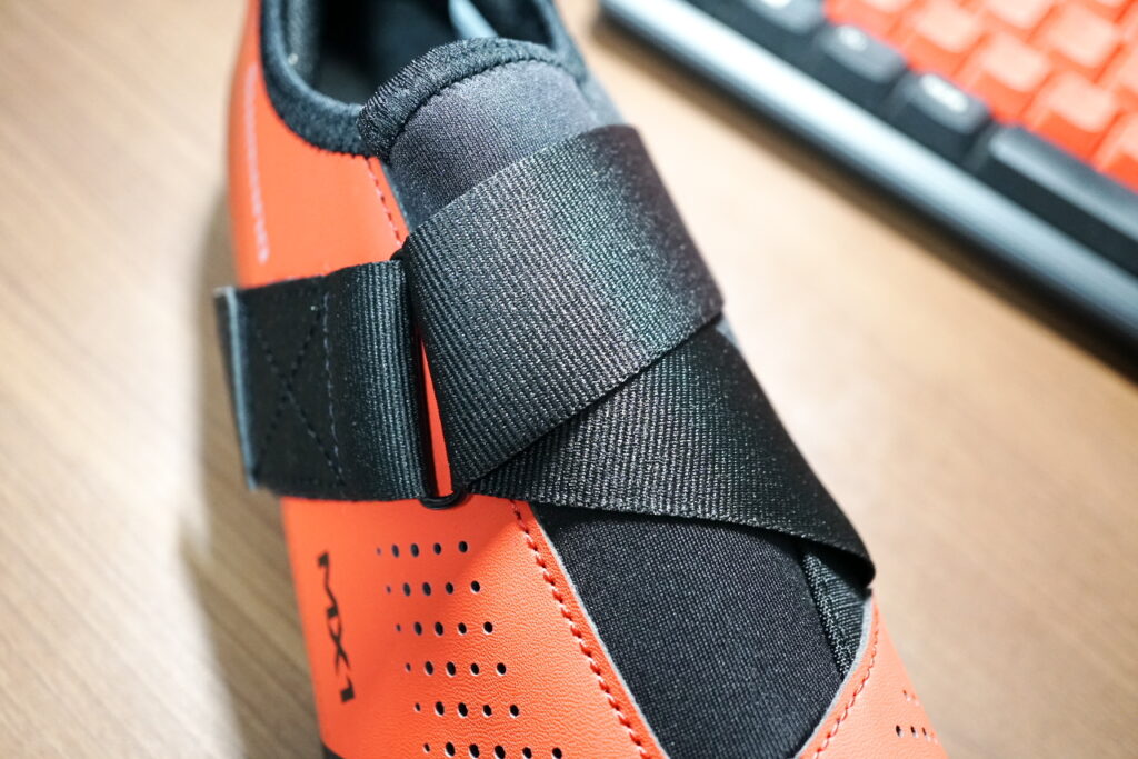 Fizi:k等でよく見る、いわゆる「クロスストラップ」方式を採用。いわゆるタンは存在せず、靴下のように履きます。
