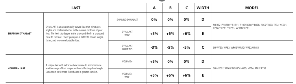 日本語の情報は見つかりませんでしたが、シマノの英語マニュアルの中にこんな表がありました。ダイナラストとVOLUME+ラストはどちらも「WIDTH: D」とされていますが、実際は全然違いました。公式ストアのレビューでも「狭い」という声が散見されます。
