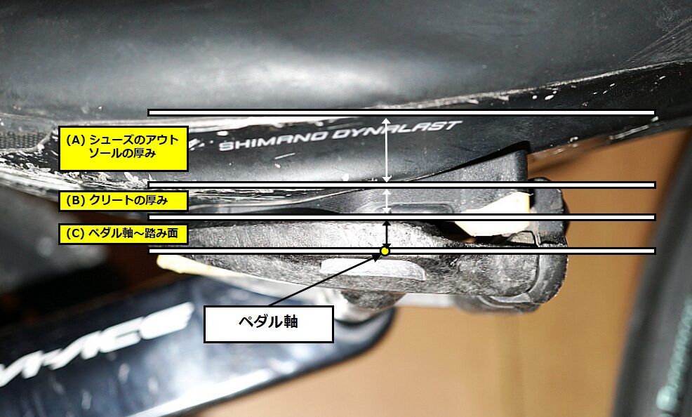| 定義1 | シューズのソール下面からペダル軸までの距離 | (B) + (C) |